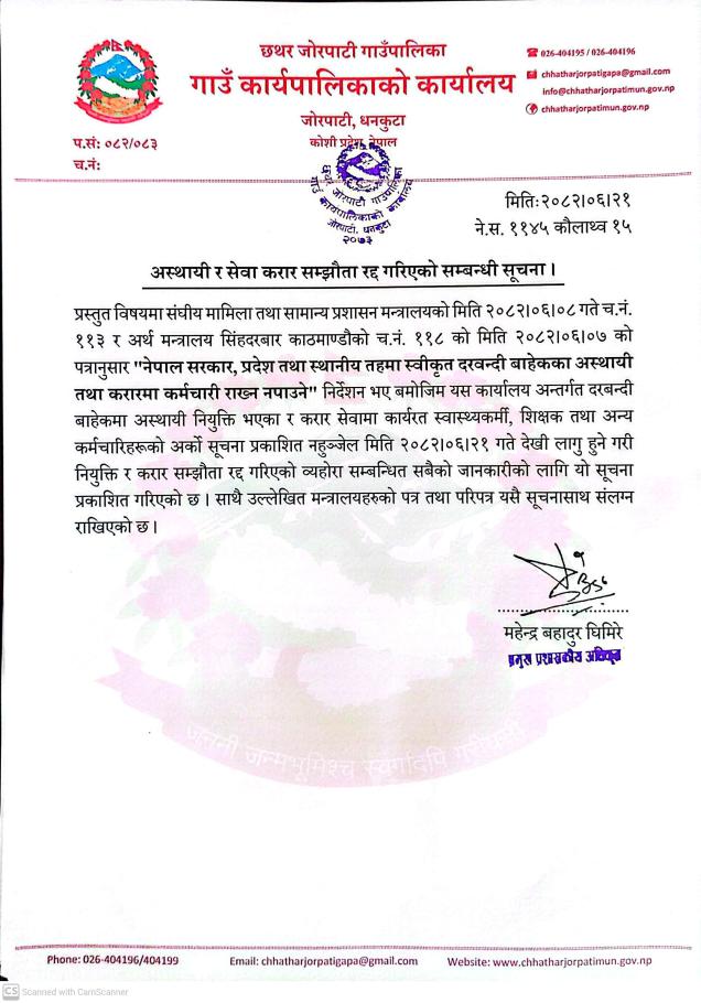 अस्थायी र सेवा करार सम्झौता रद्द गरिएको सम्बन्धी सूचना ।
