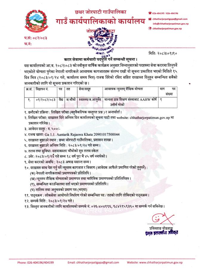 करार सेवामा कर्मचारी पदपुर्ति गर्ने सम्बन्धी सूचना ।